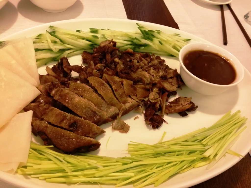 Tocmai redeschisesera restaurantul dupa Revelion, asa ca nu aveau o parte dintre feluri in meniu, cu ne si asteptaseram, de altfel. Am luat un pui picant si niste vinete cu usturoi, bune amandoua; o salata de alge de mare asa si asa, care nu era o salata, de fapt, ci doar alge murate, si “o jumatate de rata afumata”, adica feliile din poza, care nu a fost buna, suficient reincalzita, probabil ramasa prin frigider de dinainte de Anul Nou. Nota pe care le-am pus-o la mancare e pentru ce ar fi putut sa ne dea sa mancam daca ar fi vrut, nu pentru ceea ce am avut efectiv in farfurie.