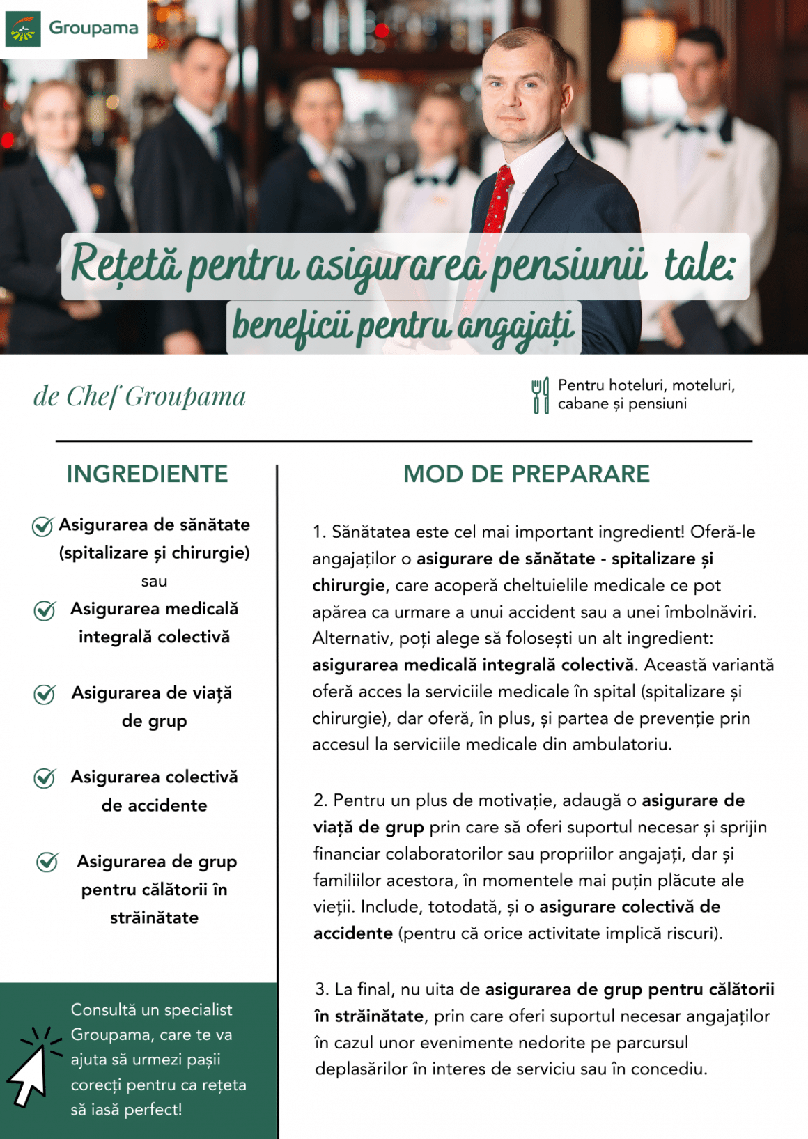 Asigurările de viață, de accidente, de călătorii și de sănătate oferite de Groupama se pot adapta bugetului disponibil și în concordanță cu nevoile angajaților. Iată o rețetă sigură de la care poți porni.