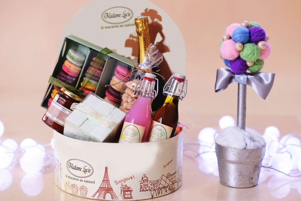 Cosurile de Craciun Panier de Noel Classic si Panier de Noel Gourmet – cu macarons in aromele special create pentru Craciun, dar si alte arome consacrate ale Madame Lucie, alaturi de multe bunatati precum dulceata, siropuri, uleiuri aromate si sampanie: