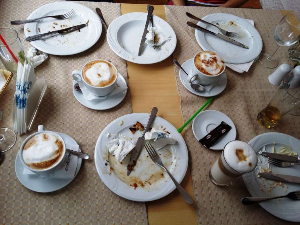 Mai incomod a fost, insa, cu masa. Nu ne-a adaus tacamuri pana nu i-am cerut. Si acesta a fost doar inceputul. Dupa primele feluri de mancare a inceput sa aduca pe urmatoarele desi farfuriile goale de la primele erau inca pe masa. Si nu doar acelea, ci si farfuriile noastre, in care mancaseram si in care erau puse si servetelele folosite, semn clar ca nu mai era nimic de facut cu ele!!! Tostusi, pana cand nu i-am spus explicit sa le ia de pe masa, nu i-a dat prin minte ca ar fi fost cazul sa o faca! Sa vezi farfuriile murdare, cu servetelele folsite deja in ele, si sa te astepti ca oamenii sa le ia si sa le puna in scrumiera (de pila), dupa care sa-si puna urmatoarea mancare tot acolo, asta da, mai rar iti este dat sa vezi intr-un restaurant. Si nu a fost o amnezie sau o fastacire de moment a chelnerului nostru de la Ellinikon – Casa Greceasca, pentru ca asa a facut pana la sfarsit. Am facut si o poza cu cafelele strecurate cu dibacie printre farfuriile murdare si cu servetelele demult in ele.