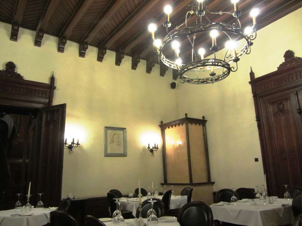 Am mers intr-o seara saptamana trecuta sa luam cina, dupa o plimbare pe domeniu, invaluit in miresme de toporasi. Mi-a placut extrem atmosfera! Parcul pustiu, intuneric, liniste superba! La parterul palatului palpaia palid o lumina, astfel ca am avut ceva emotii in privinta disponibilitatii restaurantului. Cand am intrat pe usa, mi-am dat seama ca va fi o seara super, sacartaitul usii imese de lemn indroducandu-ne in atmosefera istorica si misterioasa.
