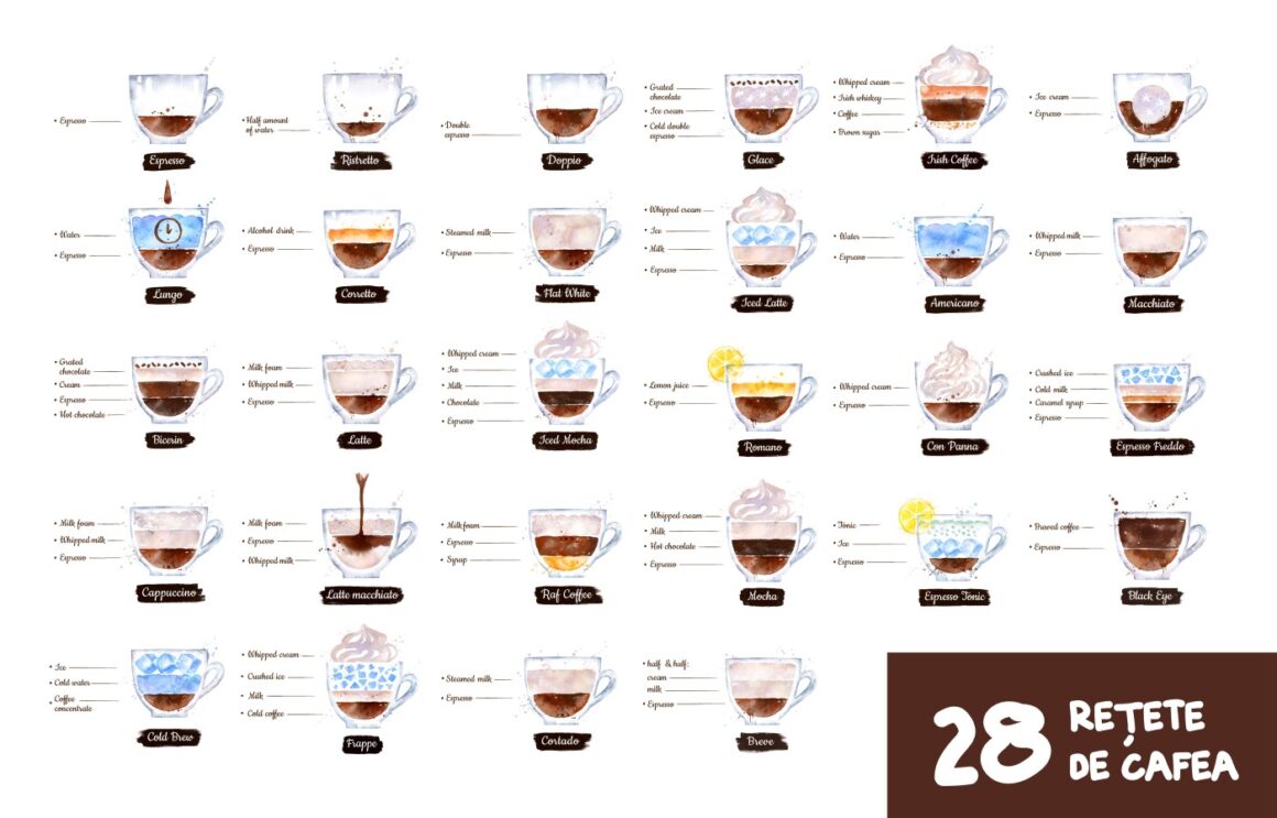Am fost cu toții acolo, la un moment dat…. Stând la coadă la o cafenea to go, confuzi în privința diferenței dintre un latte și un cappuccino, comandând până la urmă un flat white sau cine știe ce altceva. Și până la urmă, care-i diferența între ele? Mai ales că mai toate băuturile din cafea cuprind trei ingrediente comune: espresso, cremă de lapte și spumă de lapte. Facem împreună un „curs” intensiv despre diversele tipuri de cafele, ca să știi data viitoare ce înseamnă fiecare preparat din lista lungă a meniului.