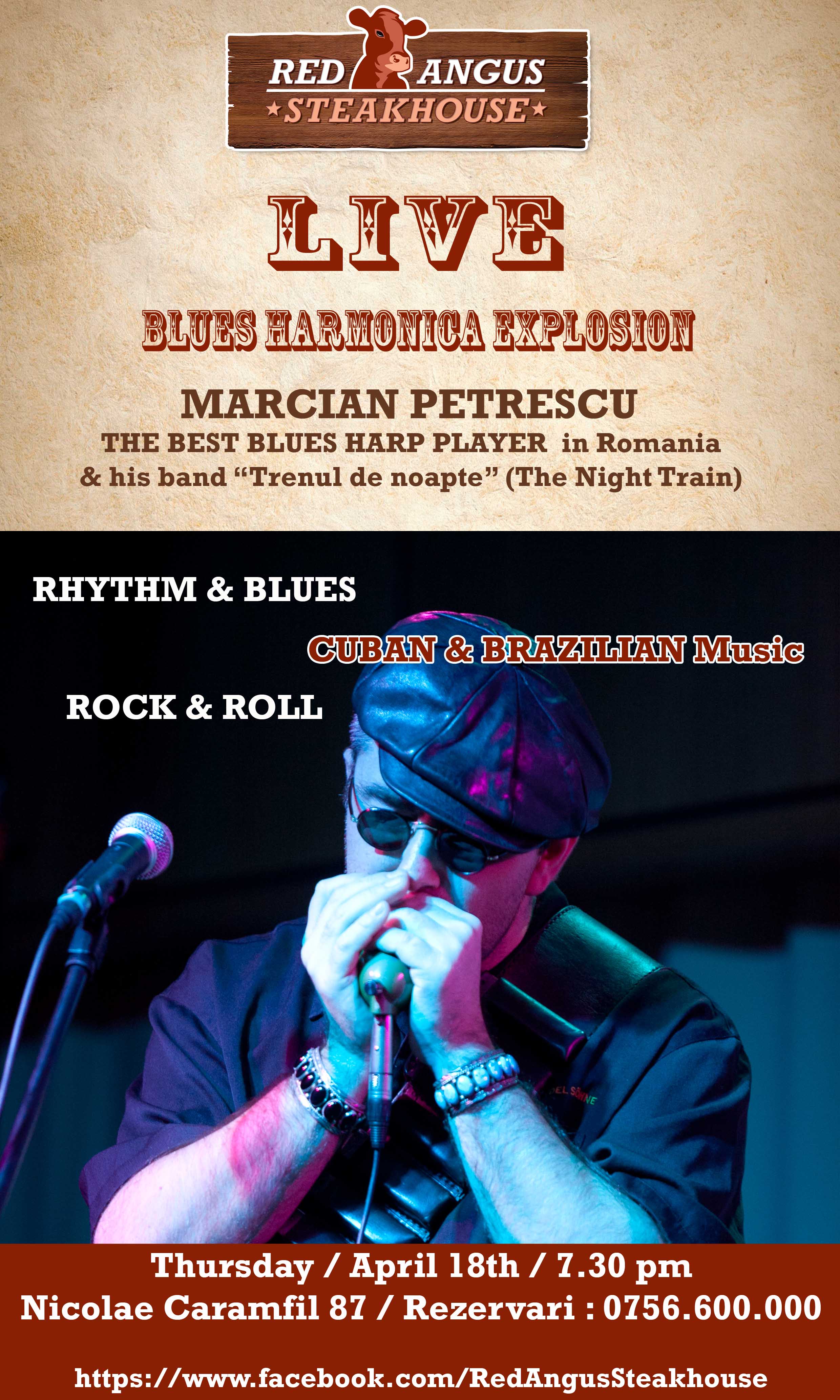 Joi, 18 aprilie 2013, Red Angus Steakhouse din bulevardul Nicolae Caramfil, nr. 87, Bucuresti, va invita sa va bucurati de un eveniment muzical de exceptie, in acordurile de blues ale celui mai bun muzicutist roman si ale formatiei sale.