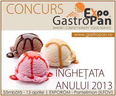 In perioada 11-14 aprilie, la centrul Exporom din orasul Pantelimon va asteapta un adevarat spectacol culinar. Concursul pentru desemnarea Inghetatei Anului 2013 este doar una dintre atractiile expozitiei GastroPan, cel mai important eveniment de specialitate autohton. Cofetari talentati vor prepara in fata vizitatorilor inghetata artizanala autentica, in cele mai deosebite gusturi si arome.