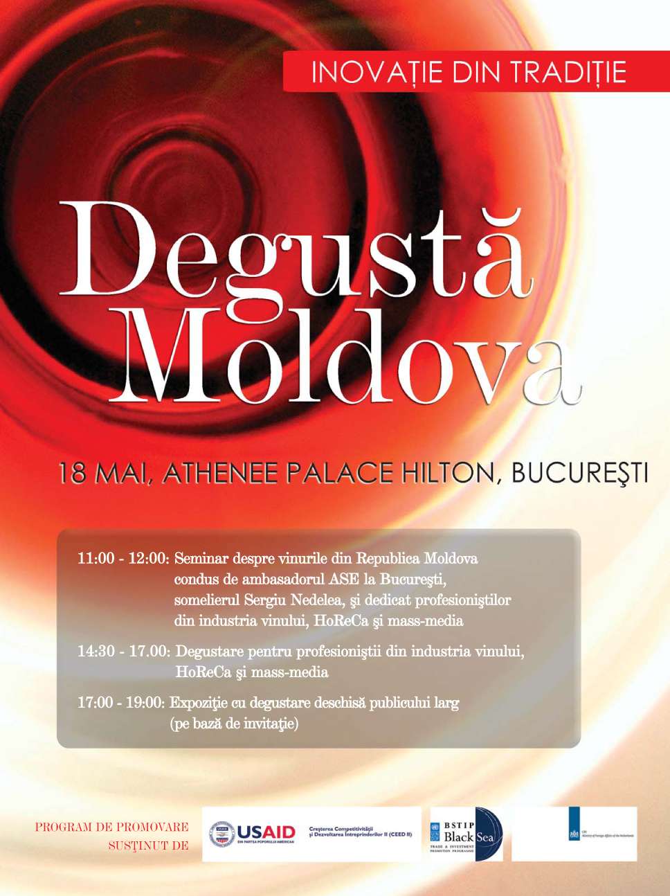 Evenimentul de la Bucuresti face parte dintr-un amplu program de promovare a vinurilor moldovenesti, program promovat de Agentia Statelor Unite pentru Dezvoltare Internationala (USAID) in parteneriat cu forul olandez CBI (Centrul pentru promovarea importurilor din tarile in curs de dezvoltare) si cu Programul de Promovare Investitiilor si Commertului in Tarile Regiunei Marei Negre (UNDP BSTIP). Expozitia vinului moldovenesc de la Bucuresti a fost precedata de doua manifestari similare, sustinute anul trecut in Praga si in Varsovia. De asemenea, cu doua zile inaintea evenimentului de la Hotel Hilton – Athenee Palace, vinurile moldovenesti vor avea parte de o prezentare similara in capitala Ucrainei, Kiev.