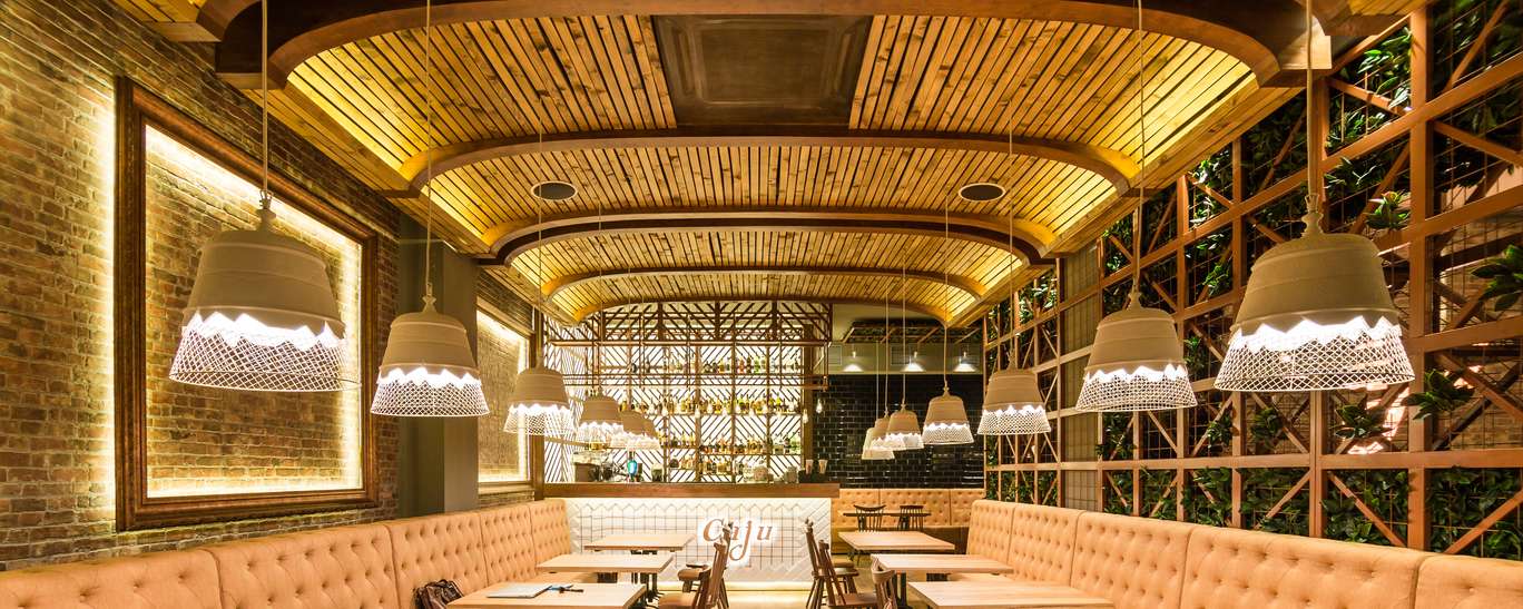 Caju are o capacitate de aproximativ 60 de persoane, iar in primavara va amenaja o terasa in stil frantuzesc, cu 40 de locuri. Pe perioada iernii, fumatorii vor avea un loc amenajat, prevazut cu sistem de incalzire. Stilul localului este realizat in traditiile unei braserii internationale, stil care reuneste combinatii lemn, metal si caramida, accentuate de lumini deosebite care pot schimba radical atmosfera localului, de la romantic seara pina la business la pranz.