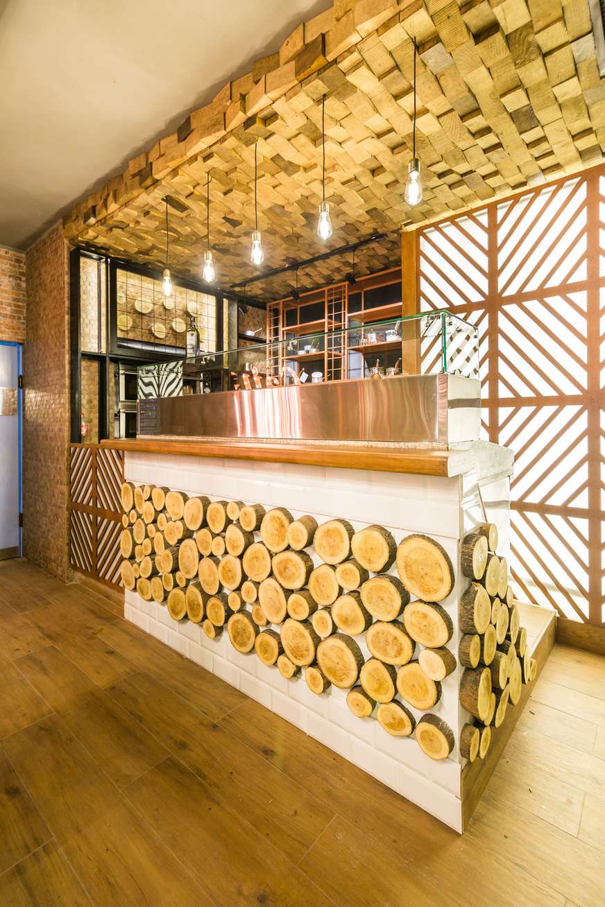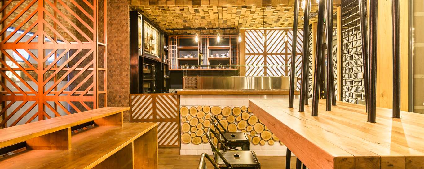 Spatiul are 3 zone, cea centrala care reuneste 14 mese si este  dominata de un tavan curbat din lemn, fiecare masa avand lustra dintr-un mix de ceramica si metal. In dreapta intrarii se afla o zona speciala, unde gurmanzii pot vedea cum se pregateste live painea marocana, in centrul spatiului fiind amplasata o masa tip bar care a fost elaborata special pentru acest local.