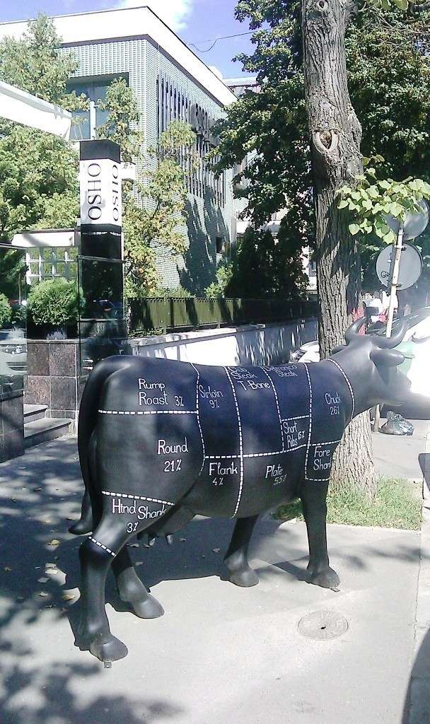 Eine Adresse fuer Feinschmecker und alle die in gepflegter jedoch aber auch lockerer Atmosphäre gerne gesehen werden. Eine Garderobe existiert nicht. Die Mäntel und Mützen werden vom Personal hinter Wänden “versteckt”. Die Gaststätte fär am Mittag und Abend (Öffnungszeiten MO-Fr von 10:30 Uhr bis zum letzten Kunden, am Wochenende ab 09:00 Uhr bis Mitternacht) ohne Tischtücher und mit vielen, wirklich sehr verschiedenen Sesseln. 92 sollten sie sein. Bis zu 700 Gäste speisen täglich in dieser offenen, American style – Kneipe. Ohne Reservierung, am Wochenende, kaum Chancen! Junges, sehr dynamisches Personal. Somit kommt jeder im Eiltempo zu seinem Genuss. Nicht weit vom Charles des Gaulles Platz auf der Primaverii Str. (nicht mit dem eher bürgerlichen City Grill Restaurant zu verwechseln!) begegnen wir OSHO, ein von vielen Expats gernbesuchtes Lokal welches eine fette, schwarze Plastikkuh, vor der Tür, als Warzeichen hat. Neben Lateinamerikahaus (Casa Americii Latine), ohne genügend Parkplätze, kommt keiner dem die Gaumenfreude was bedeutet, am OSHO vorbei. Politiker sowie Schauspieler, Journalisten und Freimaurer, ausländische Diplomaten und Geschäfstleute, drängeln sich die fein tranchierten Rindsteaks aus OSHO’ s lukullischer Bibliothek zu geniessen. Während einer Aufbewahrungsfrist von mindestens 21 Tagen können im durchsichtigen Eiskasten T-Bone Steaks, portionierte Porterhouse, Aged New York Steaks und saftige Delmonico Steaks bewundert werden. Alles Rind! Das Resultat versetzt Fleischkenner in Ekstase: Dry Aged Beef, das trocken abgehangene Rind, liefert die besten Steaks der Welt. Die Speisekarte schlägt noch ein Breakfast in Manhattan (RON 28,- bis 35,-), Salads from Tuscany (RON 28,- bis 32,-) sowie Famous Miami Burgers and Sandwiches (RON 24,- bis 32,-) vor. Der Inhaber, Cokyapici BORA war mal selbst Koch, was die sorgfältige Art der Herstellung der Gerichte erklärt. Der rumänische Chefkoch Radu Filip Orlando bereitet 20 verschiedene Sorten Rind, Lamm und Geflügelsortimente vor. Ein New Jersey Steak “trocken” 600 gr. mit OSHO – Bratkartoffeln, hauseigenes Tomaten- und Olivenbrot (immer gratis dabei) sowie frischem Salat kostet saftige RON 170,– Die Weine aus aller Welt sind reichlich vorhanden. Weine werde auch offen serviert, eine hauseigene OSHO Marke ist auf jedem Tisch vorhanden. Mittelmäßiger Merlot & Feteasca Neagra (rum. Sorte) ist für RON 35,- die 750 ml. Flasche sowie RON 10,- ein Viertel zu haben. Die typisch amerikanischen fast-food Zwiebelringe (RON 8,- ) sind genießbar. Ausgezeichnet die im braunem Zucker gebratenen Möhren (RON 7,-). Ich empfehle sehr gerne das Restaurant OSHO in Bukarest. Im selben Häuserblock öffnet derselbe Inhaber und Koch auch ein Fischrestaurant. Mit angenehmeren Preisen und bester Qualität. Schon am Sommeranfang sollte es so weit sein. Bis dann kaufen wir uns noch rohes Fleisch, herrlichen, geräucherten Büffel – Mozarella sowie guten Schinken für zu hause, auch vom OSHO. Das Rind Restaurant in Bukarest.