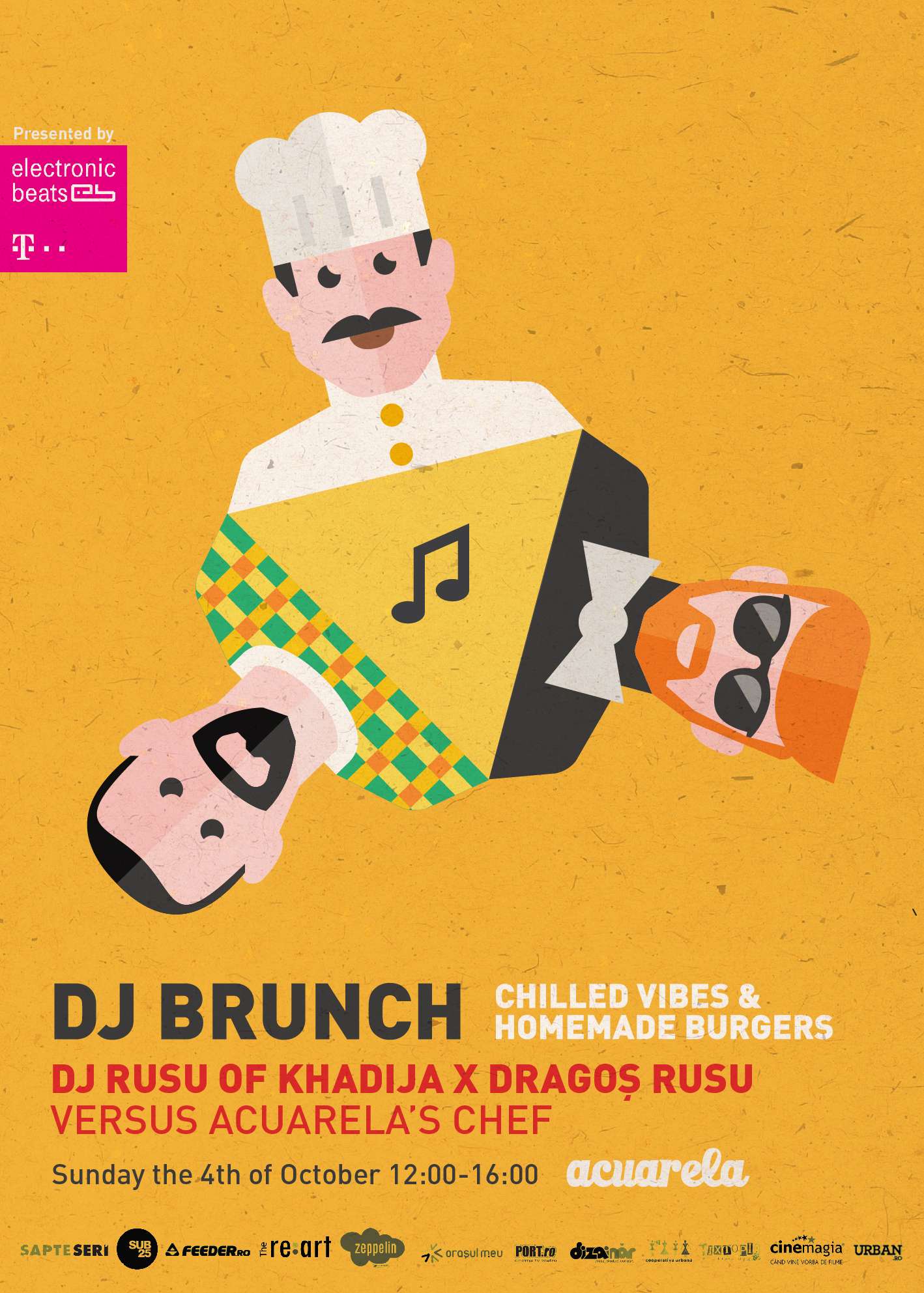 Week-end-ul acesta, gradina cafenelei Acuarela e deschisa pentru beat-uri electronice, dar si pentru un ospat cu burgeri facuti in casa. Duminica, intre 12:00 si 16:00, in gradina Acuarela se va incinge un brunch la care muzica e asigurata de 2 DJ-i, Rusu of Khadija si Dragos Rusu. Pe un sound chill, de week-end, chef-ul Acuarela va pune la dispozitie burgeri facuti in casa.