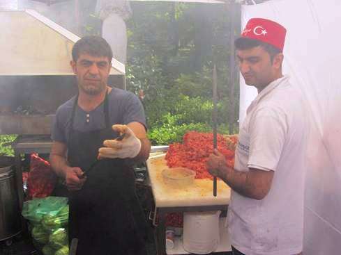 Desi am inceput sa inspectez tarabele destul de entuziast, inainte sa se porneasca focurile, m-am dezumflat cand a sosit ora mesei si am incercat preparatele. Imi puneam deja intrebari cand am vazut chiflele descarcate din masini. O chifla proaspata si buna face cat jumate de sandwich, iar acestea pareau trecute bine. Sis kebab-ul a fost primul incercat. Am luat un mix de vita si oaie, tocata, coapta pe sabie. Am luat si cu bucati de vita. Au fost OK, desi extrem de subtiri la gramaj, maximum 250 de grame, si credeti-ma ca ma pricep la gramaje. 15 lei, 250 de grame, cu tot cu lipie, ceapa si varza din belsug. Dar prospetimea carnii a contat mai mult.