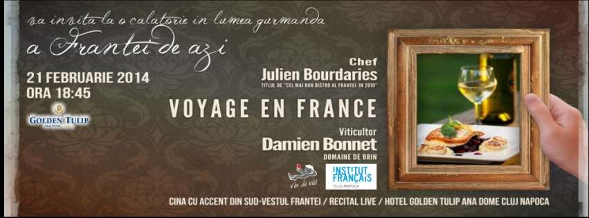 Dupa intalnirea cu Isabelle Legeron Master of Wine din octombrie 2013, va invitam la o cina-calatorie in lumea gurmanda a Frantei de azi. Un eveniment unic la Cluj Napoca, in prezenta inedita a chef-ului Julien Bourdaries si a viticultorului-eonolog al Domeniul Brin, Damien Bonnet. O ocazia de afla direct de la profesionisti ai momentului din Franta, despre importanta alegerii materiilor prime de calitate si despre un ”savoir-faire” cu tehnici traditionale aduse la zi prin cele moderne. Veti descoperi aceste lucruri prin GUST dar si DIRECT, avand posibilitatea de a interactiona cu cei 2 invitati, veniti special pentru acest eveniment. Mai mult decat o cina romantica cu acente din sud-vestul Frantei, o ocazie de a va afla fata in fata cu oameni de calitate, produse, gusturi si metode noi. Amatori de calatorii culinare, gurmande si vinuri naturale, veniti la o seara deosebita!