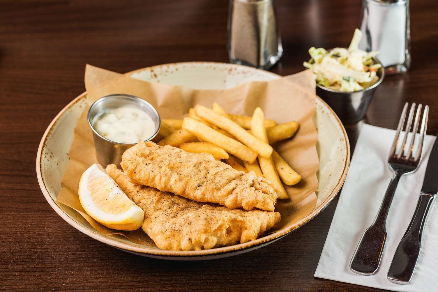File de cod pane, in crusta aurie cu bere Holsten, servit cu cartofi prajiti, sos tartar si salata de casa Coleslaw.