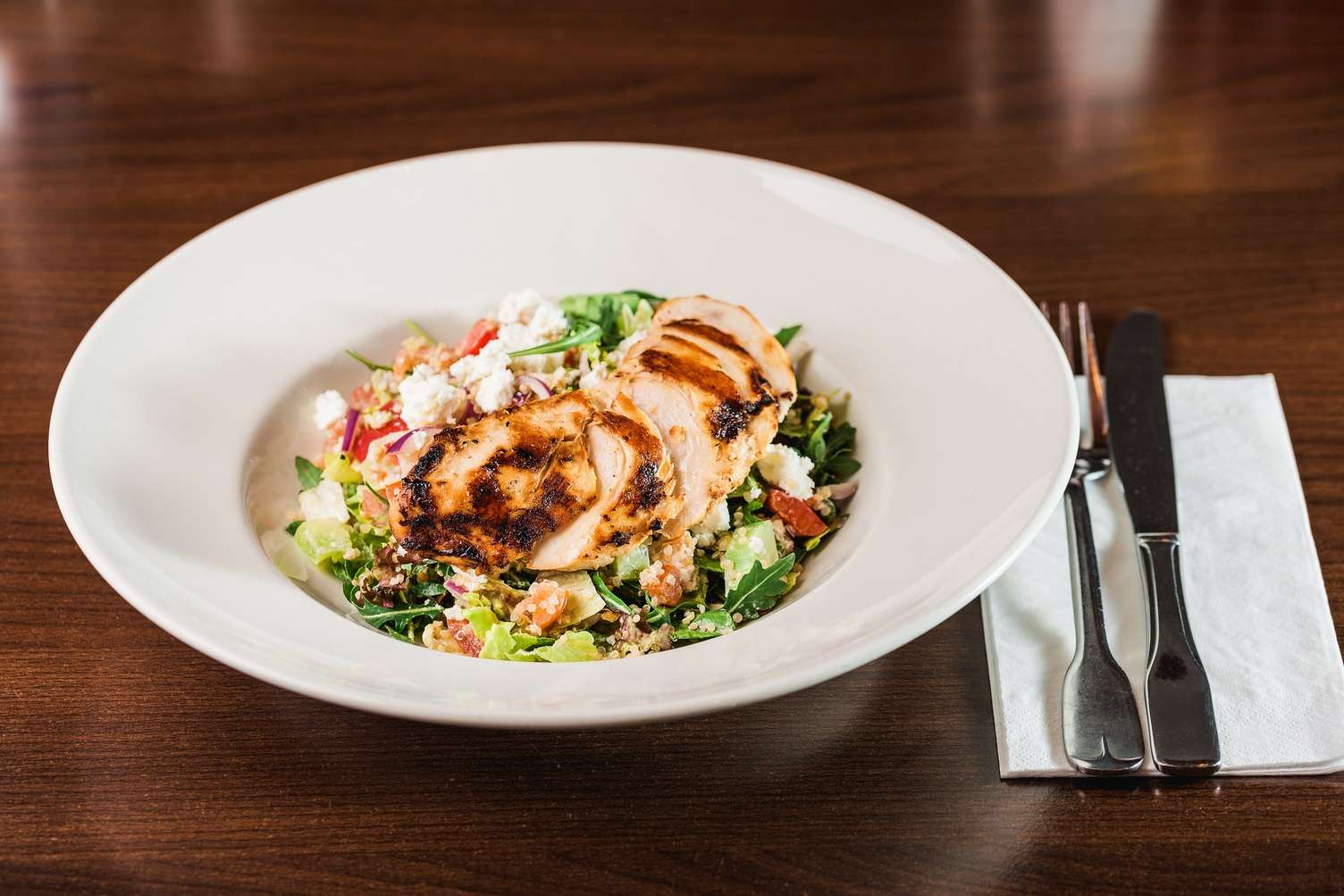 Mix de salata verde cu legume proaspete, branza Feta, amestec de rosii cu seminte de quinoa, stropite cu dressing de otet balsamic alb si lamaie proaspata. Salata vine insotita de un piept de pui marinat la gratar.