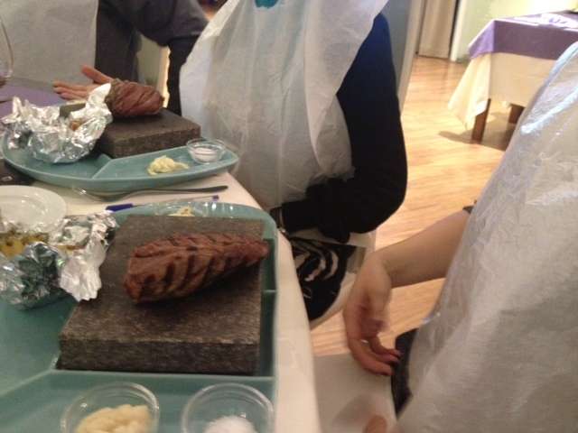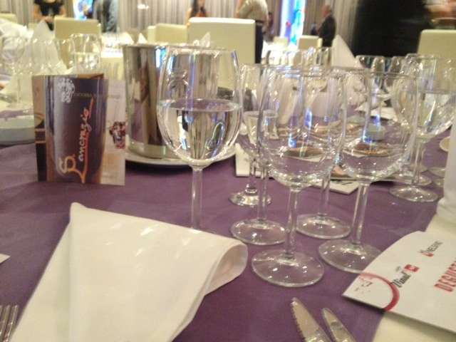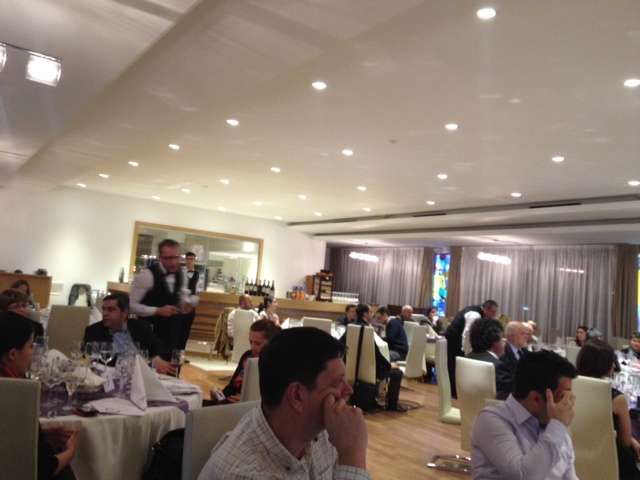 Spre deosebire de alte evenimente, in care vinul este in central atentiei si, intre diferite soiuri iei anumite gustari care iti tin papilele apte de degustare, de data asta organizatorii s-au gandit sa ne ofere o masa in toata regula. Adica antreuri, fel principal si desert. Totul a fost foarte bun, iar felul principal ales de cei mai multi meseni a fost muschi de vita pe piatra incinsa, ceea ce ne-a facut sa primim niste babetici imense, sa nu sara sosul pe noi (vezi foto). Intre felurile de mancare primeam mostre de vin din soiurile mentionate mai sus si puteam scrie impresii pe o foaie, fara sa dam note. Cel putin asa am crezut si asa am facut, pentru ca nu am primit instructiuni. Am fost serviti cu feluri de mancare potrivite pentru vinurile rosii degustate, daca lasam desertul la o parte. Riscul unui asemenea demers este insa ca mancarea ajunge sa concureze vinul, daca organizatorii nu sunt suficient de activi, astfel incat sa tina participantii in priza.