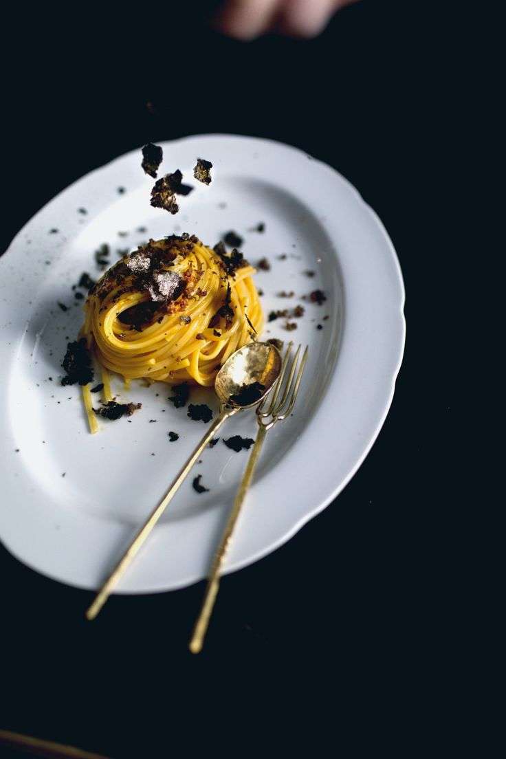 Walnut, porcini, truffle & rucola sauce in black pepper buckwheat fettuccine (Fettucine din hrisca cu alune, porcini, trufe si sos de rucola cu piper negru)