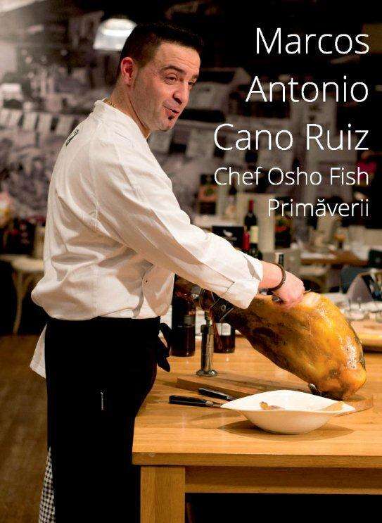 Drintre specialitatile create de Chef Marcos la Osho Fish se pot enumera Calcan la gratar cu sos de prosecco si creveti, Midii in sos pescator cu vin Sauvignion Blanc, Creveti din Almeria in pat de sare la gratar, Creveti jumbo cu sos de usturoi si ceai de menta, Caracatita la gratar cu paprica picant si cartofi la gratar, Calamar la gratar cu mix de salata si sos de patrunjel, usturoi si ulei, Jamon de Almeria cu creveti, Calcan file in sos de sofran si ciuperci.