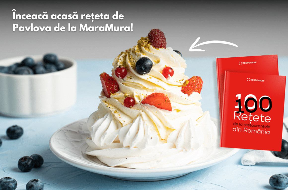 Și de la ei avem o rețetă delicioasă de Pavlova, extreeem de fină și delicioasă ! O găsești în cartea în cartea 100 de Rețete de la Restaurantele din România. Comandă cartea aici.