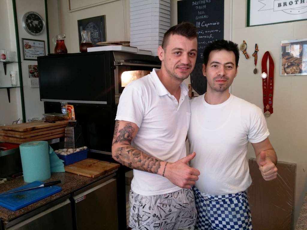 Numele “Brothers” vine de la cei trei frati care au pornit aceasta afacere, Claudiu, George si Florin Toader, “care fac pizza de cand se stiu si au adunat zeci de diplome la concursuri internationale de profil” – asa cum se prezinta ei insisi. Baieti tineri si vanosi, de cartier, cu tatuaje si cu alti markeri sociali in display, cu insolenta aferenta statutului de odata aparut in televizor pe la nu stiu ce emisiuni cu duduite gurese si agramate si flacai in perpetua erectie.