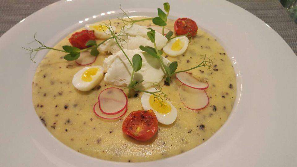 Pentru a-l familiariza si cu preparatele autohtone, starul international a fost servit si cu “Gustul Ciobanului” un preparat savuros, din bucataria romaneasca reinterpretata, facut din mamaliga fiarta in lapte, trufe culese din Padurea de la Viscri, oua de prepelita, chipsuri de chorizo si spuma de telemea de oaie.