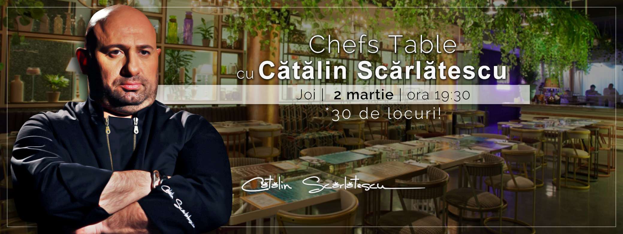 Evenimentul se va desfasura intr-o atmosfera eleganta, dar totodata relaxata, unde cei maxim 30 de participanti vor fi rasfatati cu mai multe feluri de mancare, prezentate si gatite de insusi Chef Catalin Scarlatescu.
