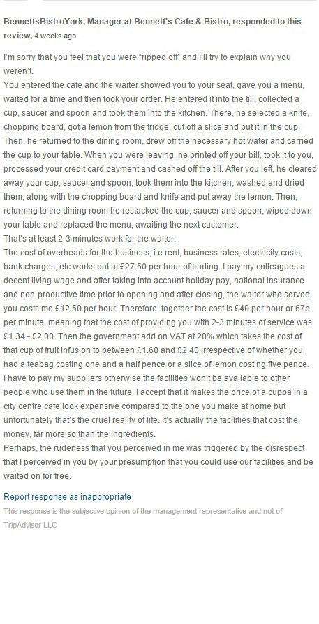 Probabil ca se astepta ca acest review sa faca valva si sa primeasca ceva din partea cafenelei in urma deranjului la care a fost supusa. O mare surpriza, insa, a fost raspunsul proprietarului care a inceput sa-i explice exact cum se justifica suma de £2: