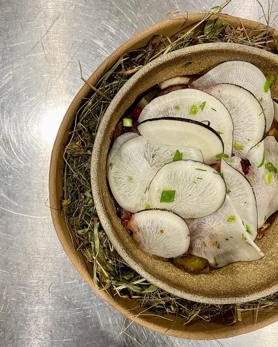 Chef Petra Hianu creează „poezie pe farfurie” pornind de la ingrediente provenite de la fermieri locali. Și, pentru a-i susține, în meniu se menționează nu doar ingredientele, ci și zonele din care provin – fie că vorbim de păstrăv, brânză, carne de mangaliță, legume sau fructe. Evident, în aceste condiții și meniul se schimbă odată cu anotimpul, așa cum se obișnuiește în orice restaurante farm tot table. În plus, și lista de băuturi cuprinde vinuri românești, dar și sucuri naturale preparate chiar de ei.