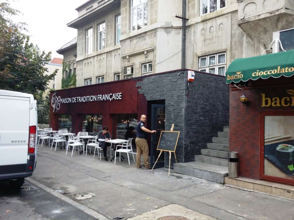 Casa e falnica, asa cum sunt mai toate casele din frumosul si bogatul cartier. Fara indoiala, inlocuirea gardului cu un spatiu comercial, de jur imprejur, pe jumatate bagat in pamant, a fost facuta de curand, dupa Revolutie, posibil chiar cu autorizatie de la primarie. Ca si la Bacio, cobori sub nivelul trotuarului si ajungi intr-un spatiu destul de stramt, in care fiecare coltisor e valorizat la maximum. Maison de Tradition Francaise e un loc e foarte bine amenajat, un concept unitar, bine realizat, cu materiale de calitate, modern, bine iluminat, cu multe becuri in interior si cu niste geamuri marite cat de mult se poate. In spate au galantarele cu prajituri si cu patiserie, mesele pentru bistrou fiind puse in fata, la geam, ca sa te poti uita pe sub fustele trecatoarelor neatente si sa te uiti la catei de la inaltimea lor, foarte curiosi, de altfel, cand vad o astfel de miscare la o inaltime la care nu sunt obisnuiti sa o vada.