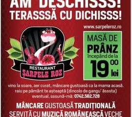 Iata ce vi se promite (extras din comunicatul de presa): “Terasa Sarpele Roz este o oaza de liniste, intr-o zona centrala unde oamenii sunt grabiti, stesati de zgomotul masinilor si cufundati in rutina zilnica. Cum ai intrat pe poarta la umbra copacilor batrani te intampina o neasteptata si nefireasca racoare si uiti imediat de canicula de afara. Este un loc minunat plin de verdeata unde poti lua un pranz delicios la preturi neasteptat de mici. Parca nici nu te-ai afla ina Piata Victoriei. Este locul unde poti petrece cu prietenii o zi perfecta ascultand o muzica veche romaneasca si savurand bucate alese. Iti poti serba ziua de nastere, terasa dispunand de zone delimitate. La Sarpele Roz va puteti racori de toropeala verii in gradina de vara beneficiind si de un adevarat spectacol in fiecare seara cu aritsti consacrati! Va ateaptam intr-o ambianta placuta indiferent de momentul zilei cu bucatarie traditionala romaneasca si un decor unic. Cand se lasa seara ce poate fi mai frumos si mai sublim, decat sa asculti sunetul viorii intr-un loc boem, plin de verdeata, inconjurat de un decor interbelic si prieteni dragi? Pentru cei care au curiozitatea sa poposeasca in aceste loc macar pentru cateva minute terasa Sarpele Roz va va face sa uitati de peisajul citadin agresiv.”