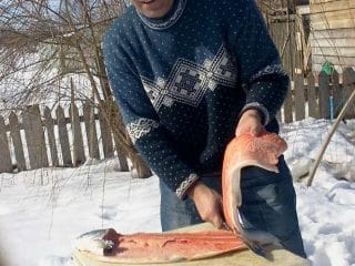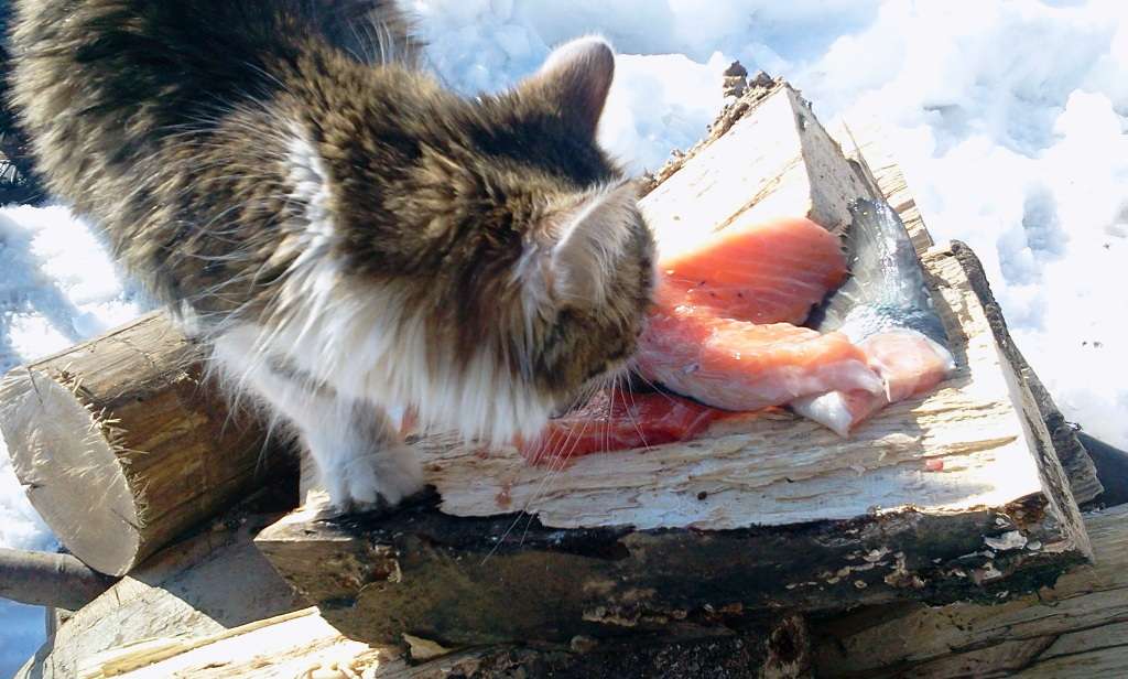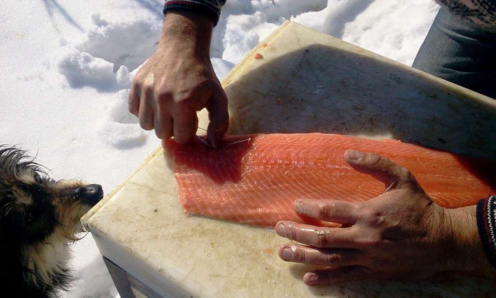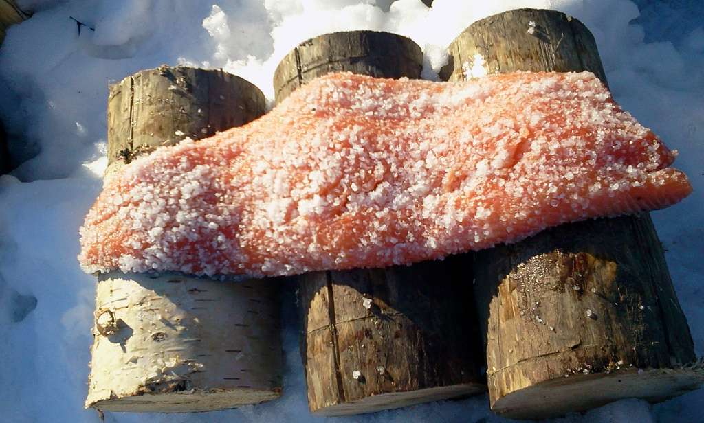 Sunt conditiile perfecte sa-mi pot pregati o buna portie de somon afumat. Afumatoarea este creata ad-hoc dupa o reteta locala, cu putina originalitate si cu rezultate surprinzatoare. Toate conditile atmosferice, intre 0 grade si -5, erau asigurate, in ceea mai mare camera frigorifica din lume, in natura.