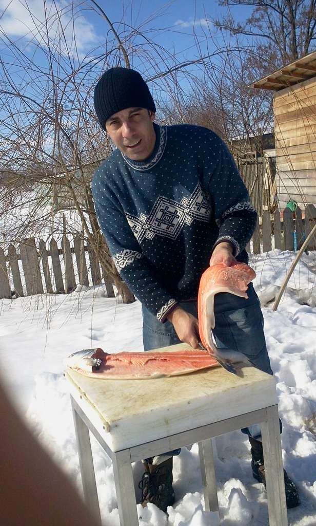 Sa ne intoarcem asadar in atmosfera de poveste. Urmarind anotimpurile, va aminteam de razele soarelui calduroase de vara in precendentul articol http://restograf.ro/ce-fel-de-meniu-am-putea-alcatui-cu-ajutorul-produselor-romanesti/ acum sa ne bucuram de racoarea iernii, asteptand primavara in mijlocul naturii. Ne-am inceput ziua de lucru energic. Cu un pic de exercitiul fizic si tuica, ne-am pregatit lemnele si am pornit focul. Somonul, selectat cu mare grija, de provenienta din crescatoriile de “eticheta rosie”, este pregatit pentru prima etapa – “efillage”.