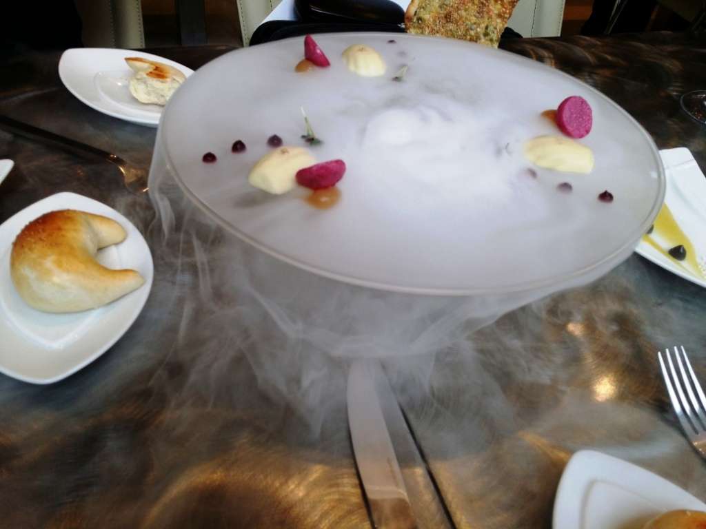 Spectacolul prezentarii de la The Artist ni s-a parut cam deplasat si disproportionat fata de calitatea mancarii din farfurie sau din ce recipient o mai fi fost acela in care ne-a fost adusa. Abuzeaza de aburi de zapada carbonica, platouri bizare pe marginea carora au pus trei picaturi de mancare, din mijloc izbucnind un mic vulcan, dar nu de mancare, ci de vapori necomestibili, linguri asezate pe masa intr-o anumita impletitura si cu incetinitorul, ca si cum ar fi trebuit sa se intipareasca pe veci in memoria si in constiinta privitorului, tot felul de astfel de exagerari pe care nici eu si nici ceilalti doi invitati nu le-am apreciat catusi de putin, mai ales ca a trebuit sa mergem sa terminam de mancat in alta parte.