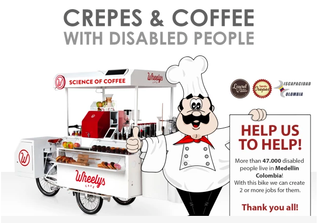 Intr-o zi ne-am trezit cu un mail de la un bucatar roman aflat in Medellin, faimosul oras din Columbia in care si-a facut de cap vestitul Pablo Escobar. Bucatarul cauta putina sustinere pentru un proiect pe care l-a inscris pe indiegogo, platforma de crowdfunding unde se regasesc proiecte sociale, inventii care cauta finantare si alte asemenea. Crepes&Coffee este un proiect care cauta sustinere financiara de la oameni pentru a oferi locuri de munca unor persoane cu dizabilitati: crearea unor puncte mobile de vanzare, niste biciclete utilitare de la care angajatii sa pregateasca si sa vanda diverse tipuri de clatite si, desigur, cafea.