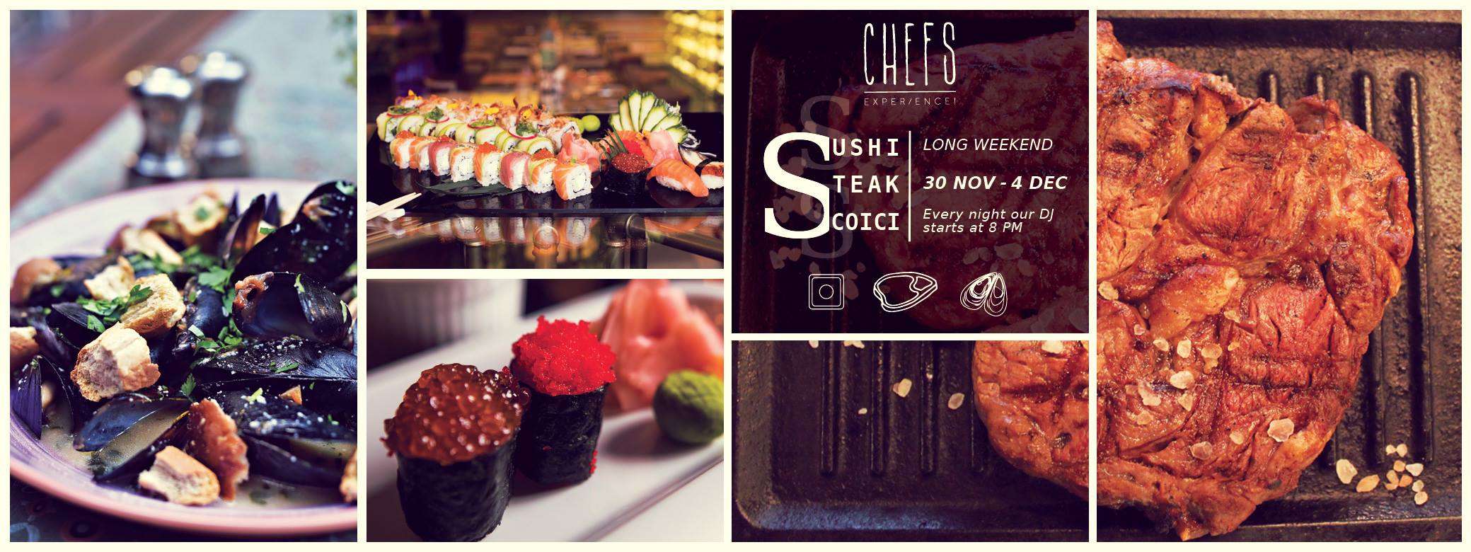 Save the date! Ne asteapta un weekend prelungit! In perioada 30 noiembrie – 4 decembrie, restaurantul Chefs Experience va asteapta sa sarbatoriti cu un trio culinar de exceptie, 3 preparate apetisante si super interesante: Sushi, Steak si Scoici!