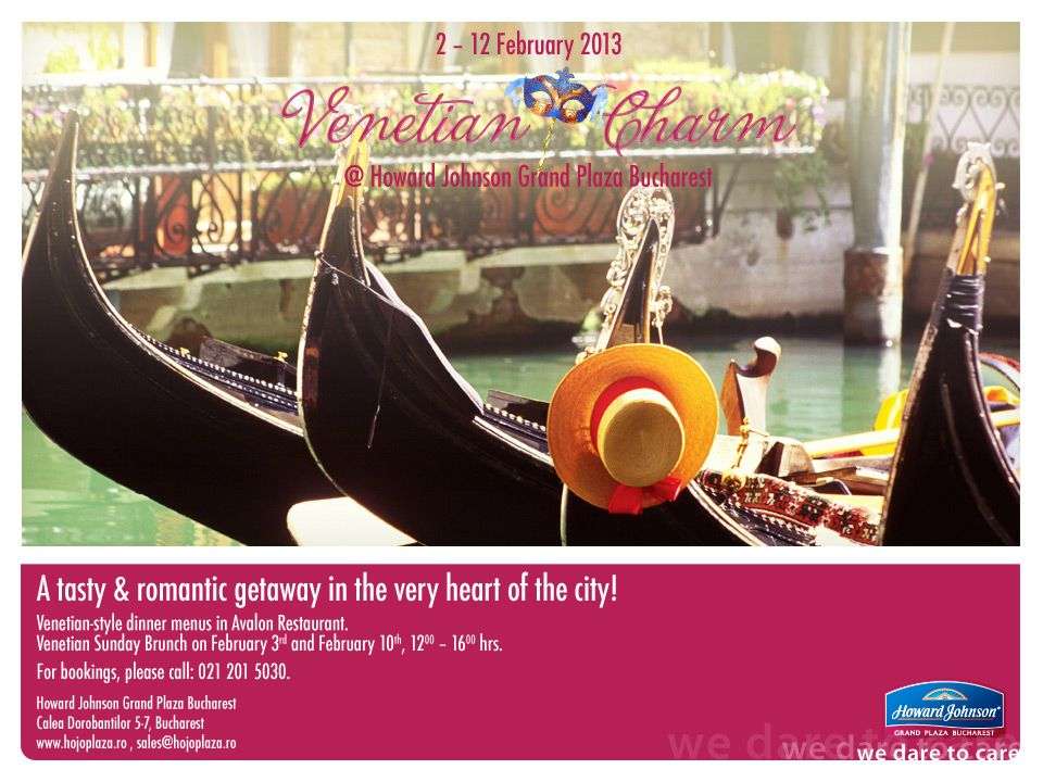 In cele doua duminici ale acestei perioade, respectiv in 3 si in 10 februarie, restaurantul Avalon va gazdui doua Brunch-uri cu tematica venetiana: incepand de la decoruri si costume si continuand, evident, cu oferta culinara si muzica ambientala, Brunch-urile Venetiene se inscriu in traditia calatoriilor culinare cu care hotelul Howard Johnson Grand Plaza si-a obisnuit oaspetii de cativa ani incoace.